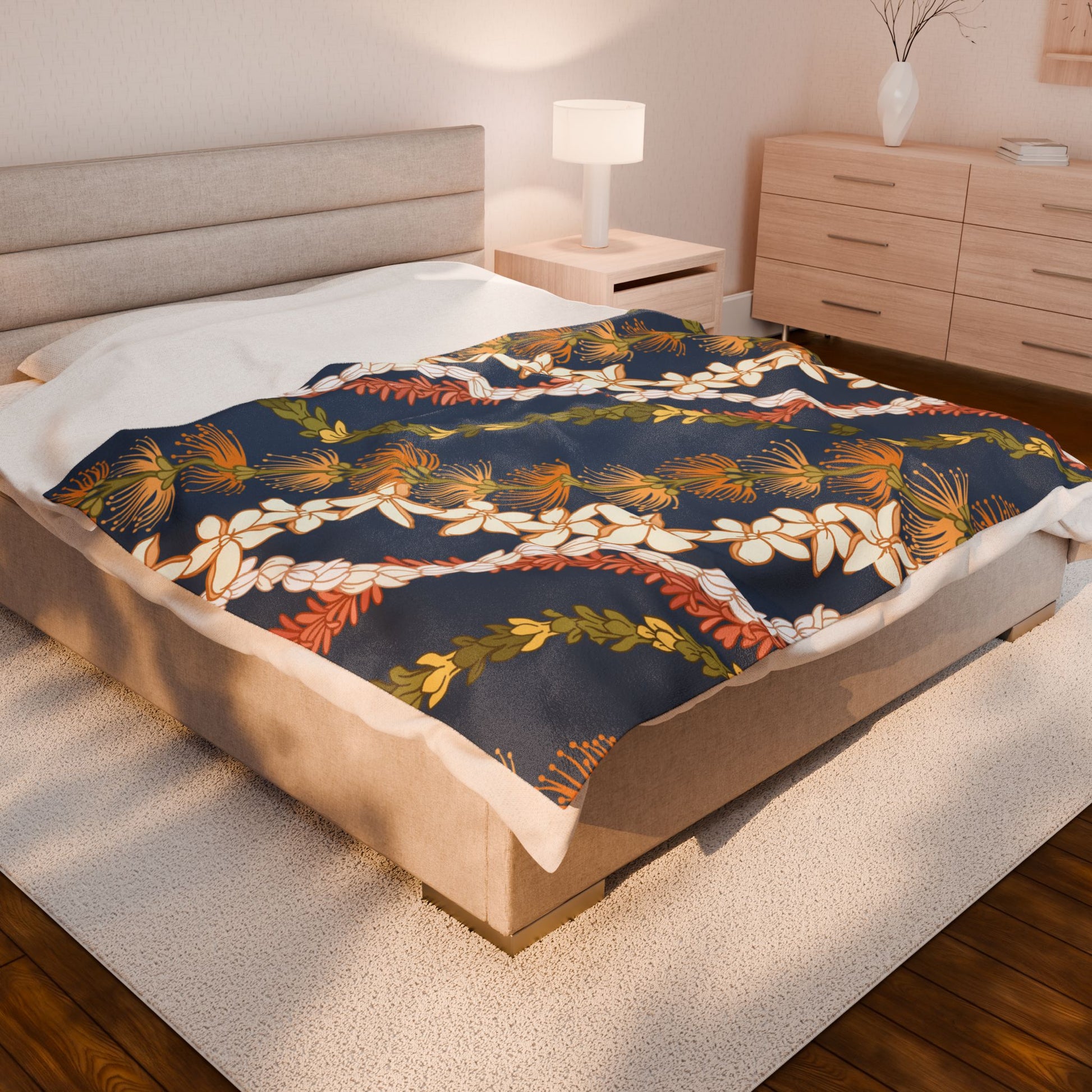Blue Grey Ohia Lehua Pikake Pakalani Lei Hawaiian Blanket , Velveteen Plush Blanket